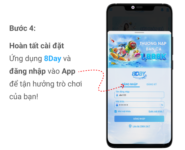 Buóc 4: Hoàn tất cài đặt ứng dụng 8day và đăng nhập vào App để tận hướng trò chơi của bạn